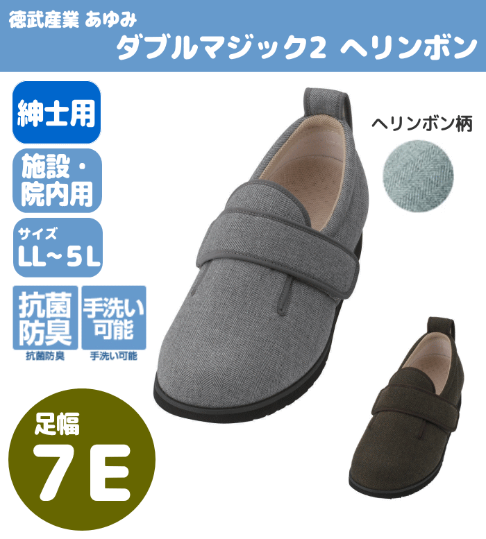 メーカー 徳武産業▼足幅(ワイズ)が異なる商品もご用意しています 商品について 商品名 あゆみ 『ダブルマジック2へリンボン』 7E 両足販売(7024) 紳士用 サイズ LL〜5Lサイズ ※重さ:片足190g(Lサイズ) 素材/材質 ○表素材:綿100% ○内素材:ポリエステル100% ○底材:合成底(EVA) 特徴 ダブルマジック2に柄物が登場!男性には定番柄のへリンボン! ○むくみの気になる方に ○施設・院内用:リハビリ、デイサービス、お散歩などにも ○サイドと甲のマジックが足をしっかり固定 足の状態に合わせて調整可能 ○履きやすさが喜ばれます 甲が全開するので履きやすく履かせやすい ○かかとループで着脱簡単 かかとにひっかけやすい親切な設計 ○つま先にゆとり ○先端に向かっての反りがつまづきを防止 ○靴底の接地面が広く安定感がある 細かい凹凸で滑りにくく安全 ○抗菌・防臭 ○オールシーズン用 ○カップインソール(メッシュコンビ) ○手洗い可能(中性洗剤、保形後陰干) ○男性用 ○足幅(ワイズ):7E ※足幅(ワイズ) 3E / 5E / 9E もございます お届けについて 宅配便でお届けいたします ※営業日午前中のご注文受付&決済完了で当日出荷(札幌・宇都宮・大阪・大分のいずれかの倉庫から発送)。